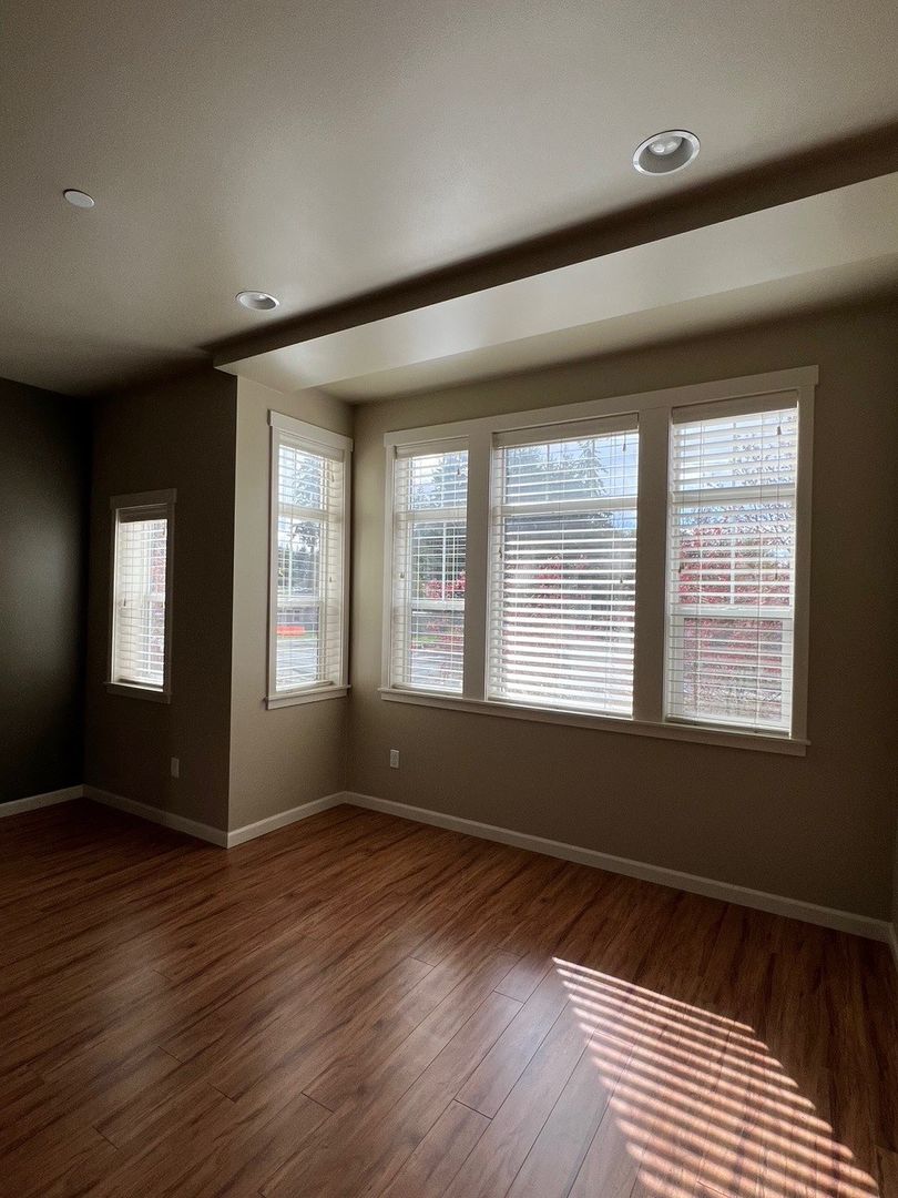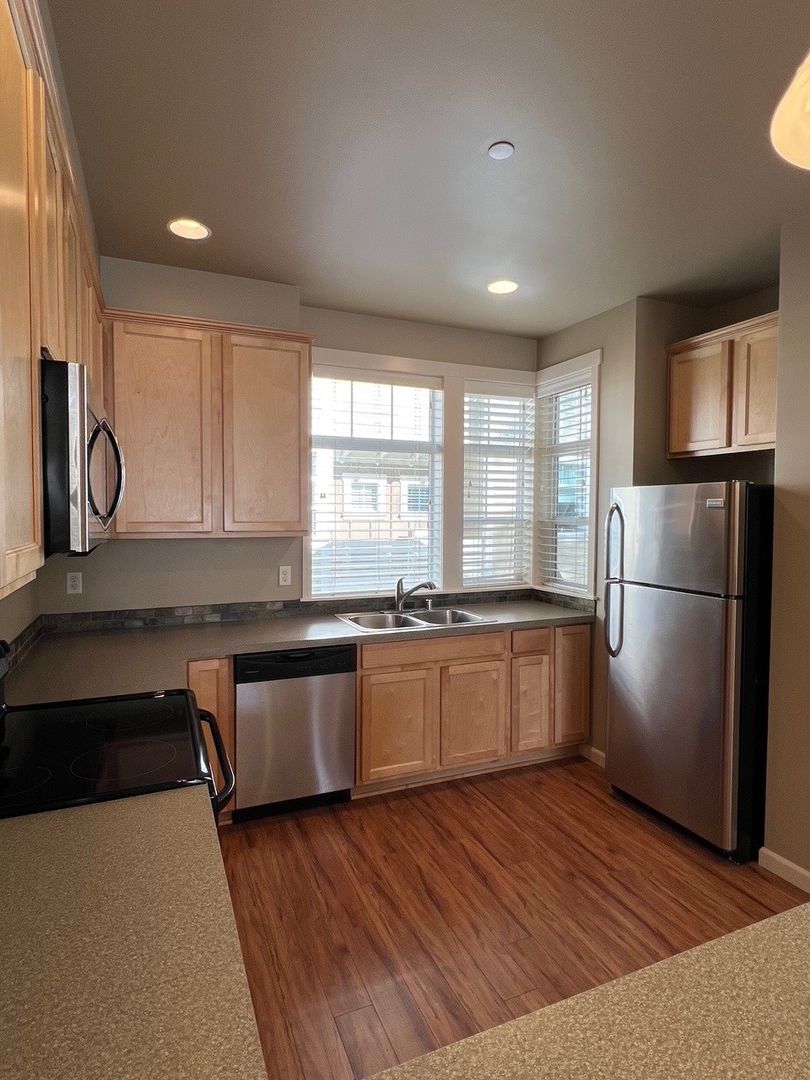 Gorgeous 3 level townhome situated in a park-like setting. Amenities include a fully equipped upgraded kitchen with premium stainless-steel appliances (refrigerator, stove, dishwasher, and microwave), disposal, pantry, tile back splashes, and taller upper cabinets for extra storage. Air conditioning, high ceilings, energy/efficient/recessed lighting, large closets, and full-sized washer/dryer. Well-designed floor plan with hardwood floors, durable carpeting, vaulted ceilings, designer color schemes, spacious rooms with open living area and plenty of natural light from oversize windows, and a private patio. Attached garage and bonus room.